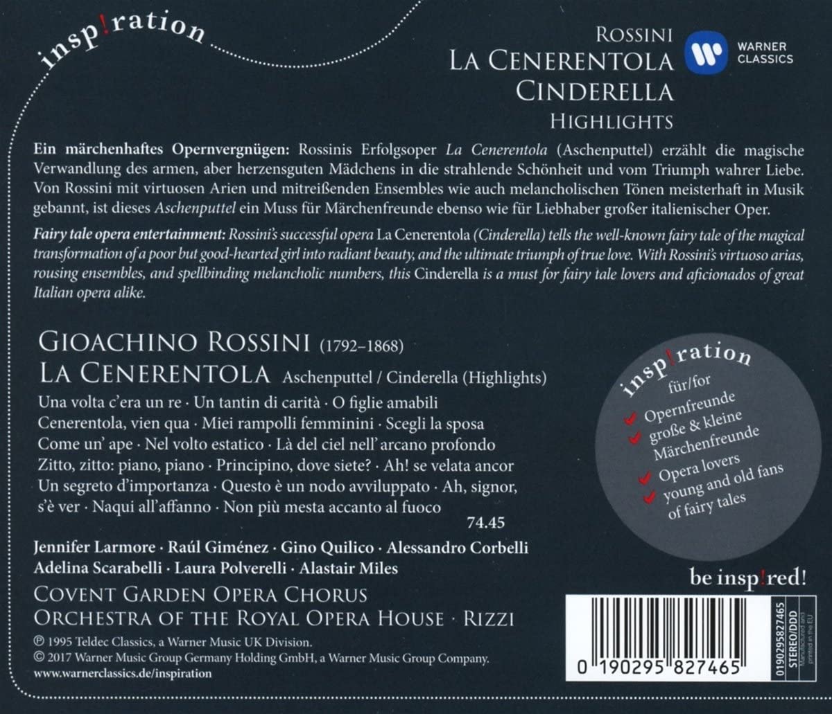 Anche se l'opera di Rossini si discosta in molti aspetti dalla nota fiaba, anch'essa racconta la storia della magica trasformazione della ragazza povera ma di buon cuore in bellezza radiosa e del trionfo del vero amore. Magistralmente catturata nella musica di Rossini con arie virtuose e toni a volte malinconici e con ensemble entusiasmanti, questa Cenerentola è raccomandata agli amanti della fiaba così come a quelli della grande opera italiana.