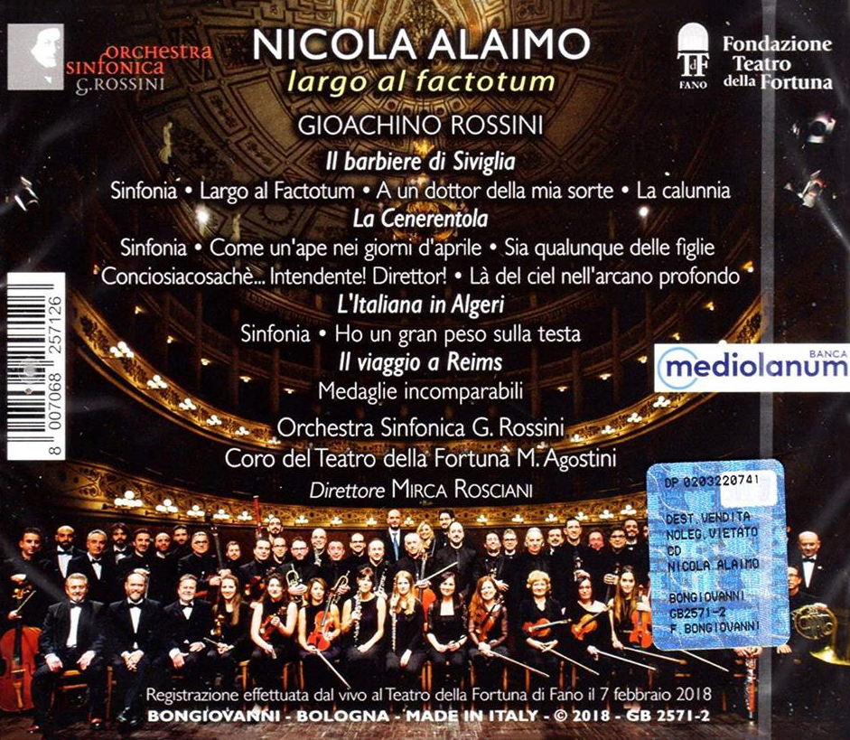 Se si scorre la cronologia anche solo degli ultimi anni di carriera di Nicola Alaimo è subito chiaro che non si sia dato confini specialistici nel repertorio. Il repertorio rossiniano rappresenta però una costante irrinunciabile. E’ un piacere ascoltarlo in questo cd, ma è anche divertimento scoprire tutte le sfumature che differenziano i diversi personaggi, altra conferma delle qualità d'interprete del baritono palermitano, capace di modellare l'emissione e affinare l'articolazione per servire tutta la musica quando è bella. La complicità con la Sinfonica Rossini è papabile.