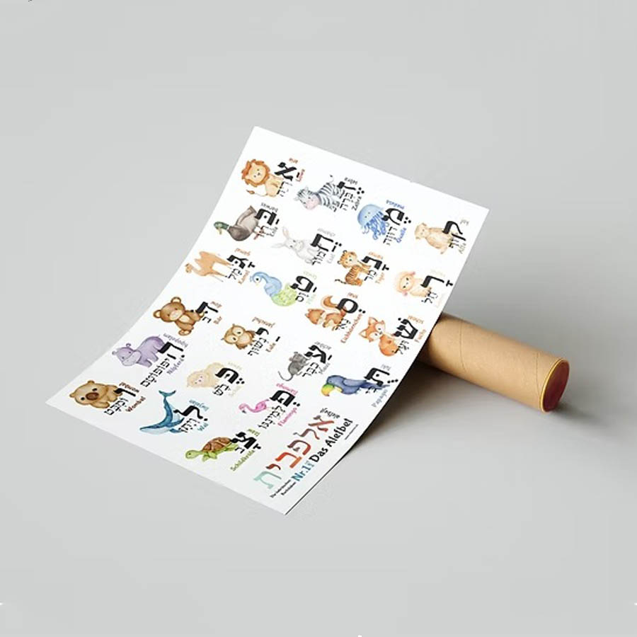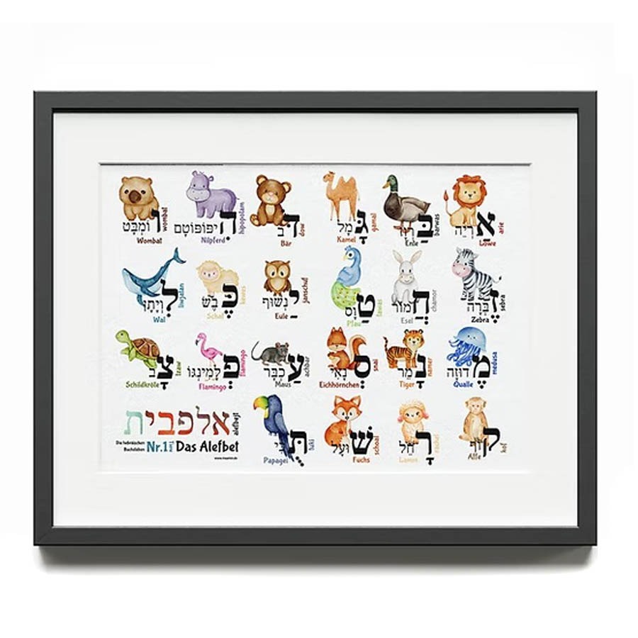 Manifesto con le Alefbet (le lettere ebraiche), formato: 42 x 30 cm. I nomi di animali sono in ebraico, inclusa la traslitterazione e la traduzione. Questo poster è un ottimo modo per i bambini di imparare l'ebraico giocando.