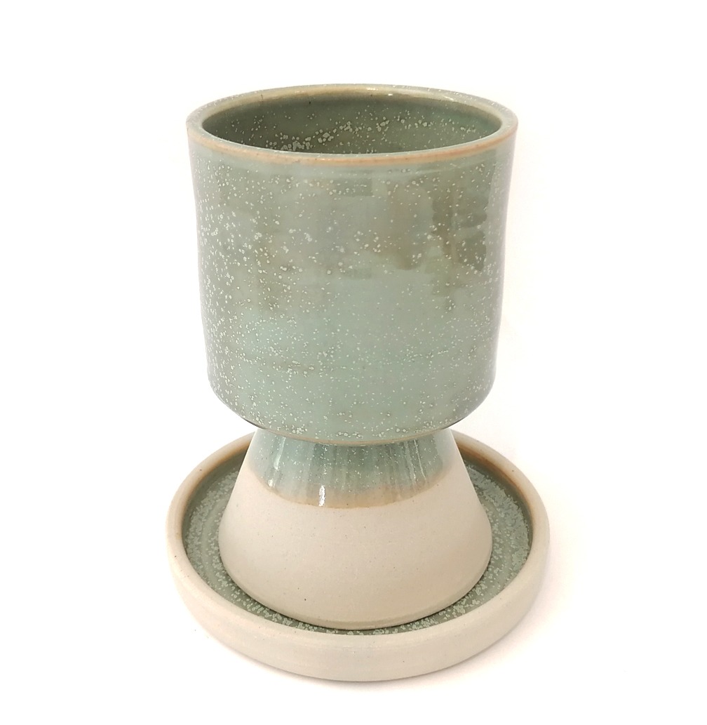 Questa elegante tazza per il Kiddush è realizzata a mano in ceramica, con un design minimalista che unisce tradizione e stile contemporaneo. Completa di piattino coordinato, è il set perfetto per arricchire la tavola dello Shabbat o delle festività.