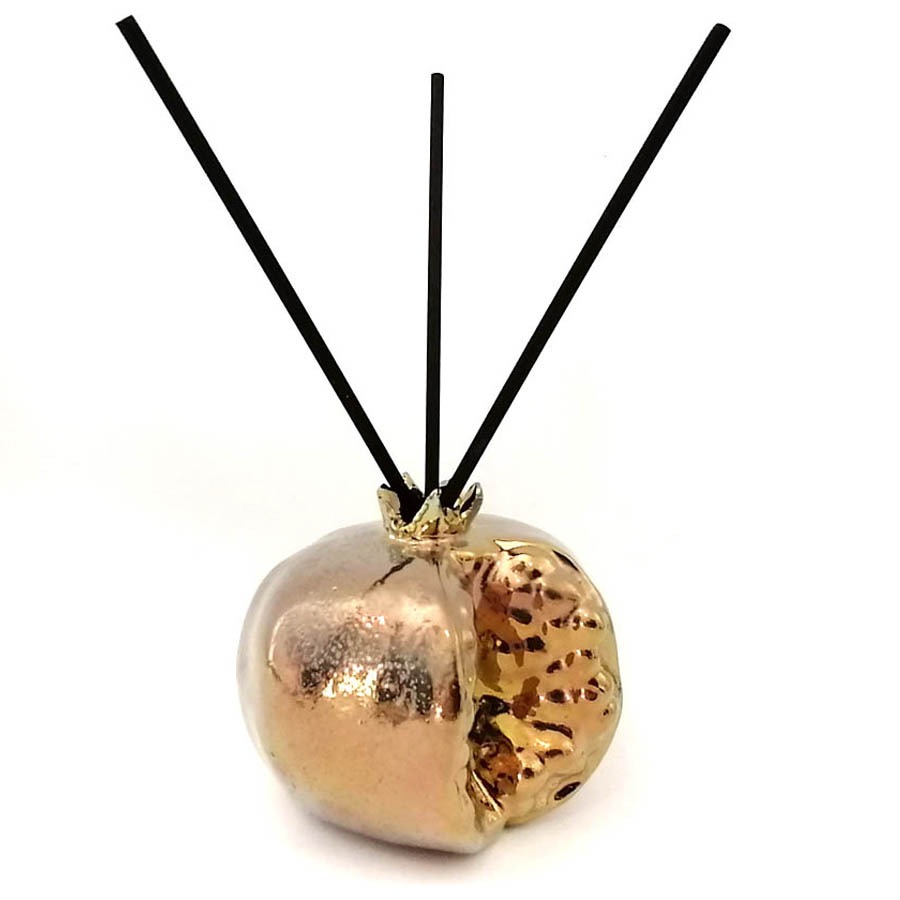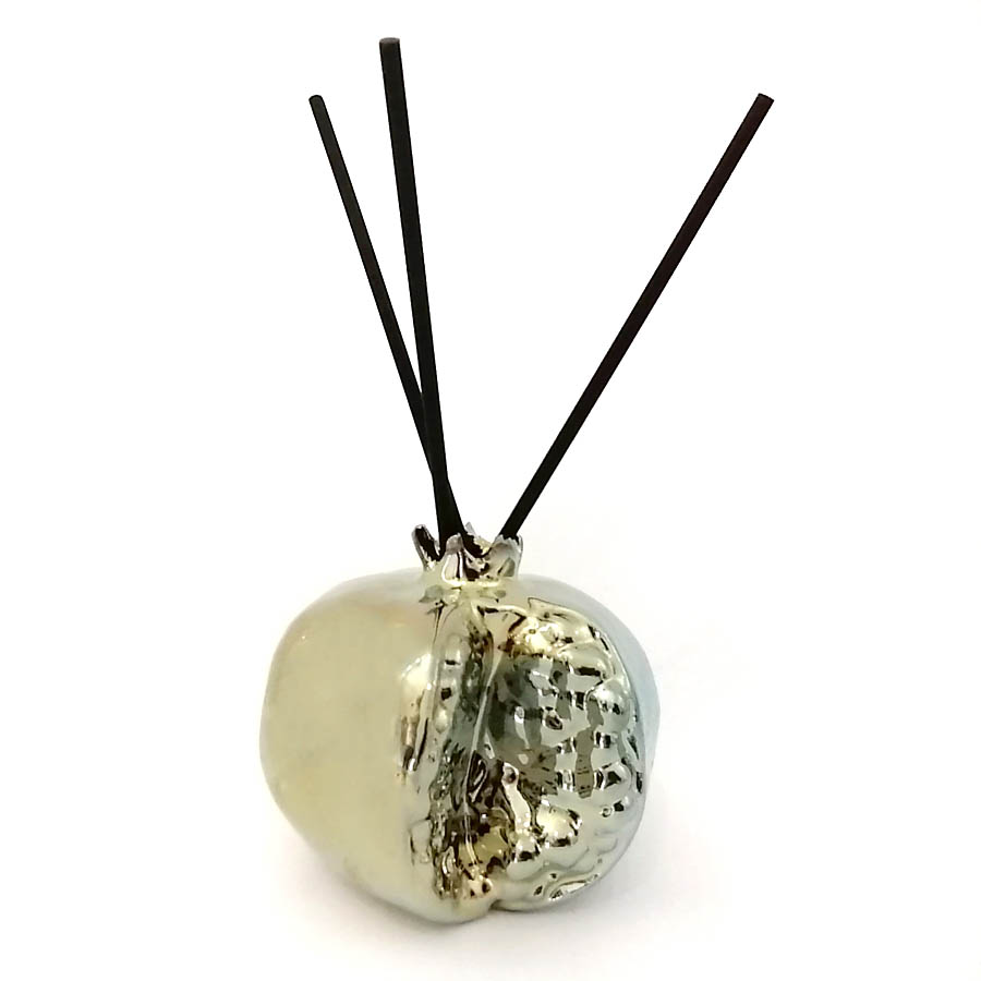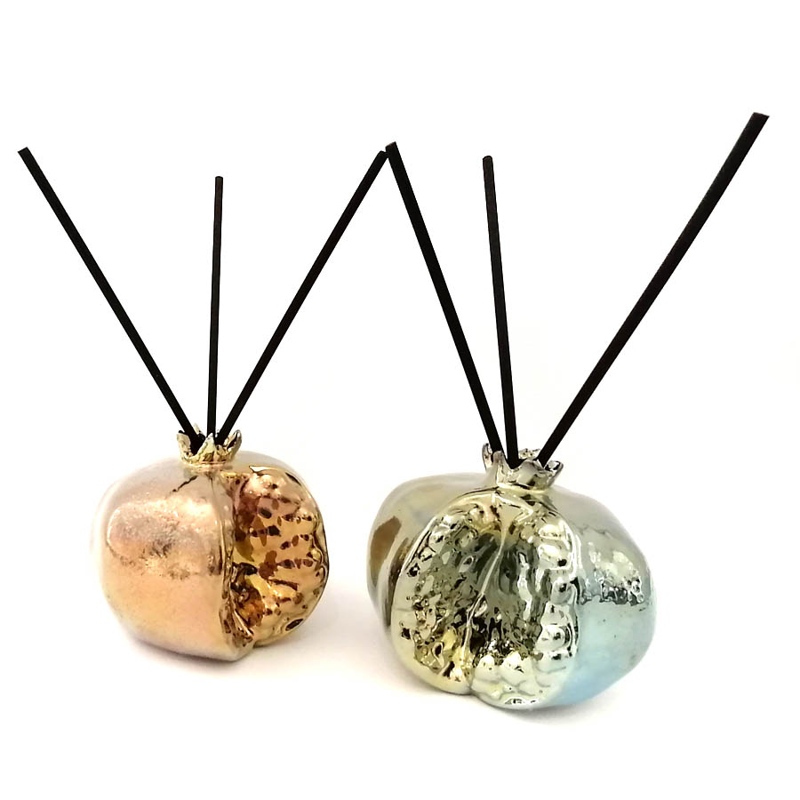Porta energia positiva nella tua casa con questo raffinato diffusore aromatico ispirato al melograno, simbolo di prosperità nella tradizione ebraica. Realizzato in maiolica a lustro, il suo design artigianale si abbina perfettamente ai bastoncini di rattan neri, per una diffusione delicata e continua di profumo.