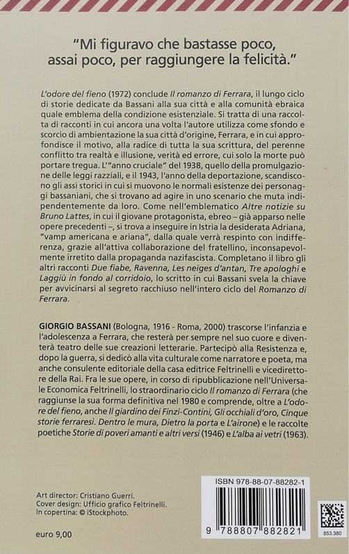 "L'odore del fieno" (1972) conclude "Il romanzo di Ferrara", il lungo ciclo di storie dedicate da Bassani alla sua città e alla comunità ebraica quale emblema della condizione esistenziale. Si tratta di una raccolta di racconti in cui ancora una volta l'autore utilizza come sfondo e scorcio di ambientazione la sua città d'origine, Ferrara, e in cui approfondisce il motivo, alla radice di tutta la sua scrittura, del perenne conflitto fra realtà e illusione, verità ed errore, cui solo la morte può portare tregua. L"'anno cruciale" del 1938, quello della promulgazione delle leggi razziali, e il 1943, l'anno della deportazione, scandiscono gli assi storici in cui si muovono le normali esistenze dei personaggi bassaniani, che si trovano ad agire in uno scenario che muta indipendentemente da loro. Come nell'emblematico "Altre notizie su Bruno Lattes", in cui il giovane protagonista, ebreo - già apparso nelle opere precedenti -, si trova a inseguire in Istria la desiderata Adriana, "vamp americana e ariana", dalla quale verrà respinto con indifferenza, grazie all'attiva collaborazione del fratellino, inconsapevolmente irretito dalla propaganda nazifascista. Completano il libro gli altri racconti "Due fiabe", "Ravenna", "Les neiges d'antan", "Tre apologhi" e "Laggiù in fondo al corridoio", lo scritto in cui Bassani svela la chiave per avvicinarsi al segreto racchiuso nell'intero ciclo del "Romanzo di Ferrara".