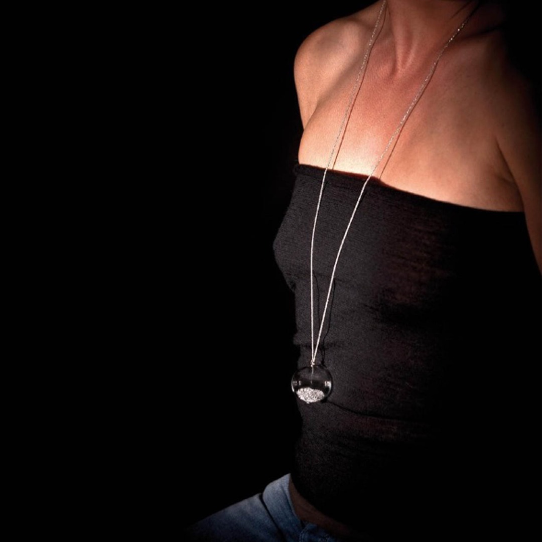 Semplice e pulita, raffinata collana in vetro borosilicato soffiato, argento e strass trasparenti. Brilla in lontananza come la stella più bella.Materiale: vetro borosilicato 3.3, strass trasparenti, catena in argento rodiato 925.