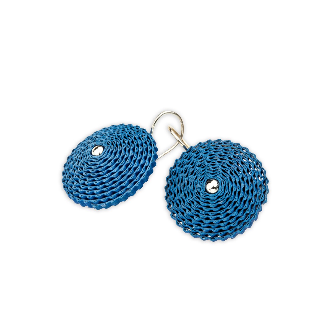 Orecchini realizzati in cartoncino ondulato colorato lavorato a mano, leggerissimi e illuminati da un puntino metallico. Chiusura in argento anallergico. Perfetti per ogni occasione.
