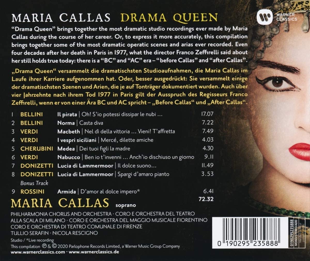 Raccolta dedicata alle interpretazioni più famose della carriera di Maria Callas. Della “Divina” Franco Zeffirelli disse: «nella storia dell’Opera come nella storia dell’umanità occorre distinguere “a.C.” da “d.C.” ossia prima della Callas e dopo la Callas».