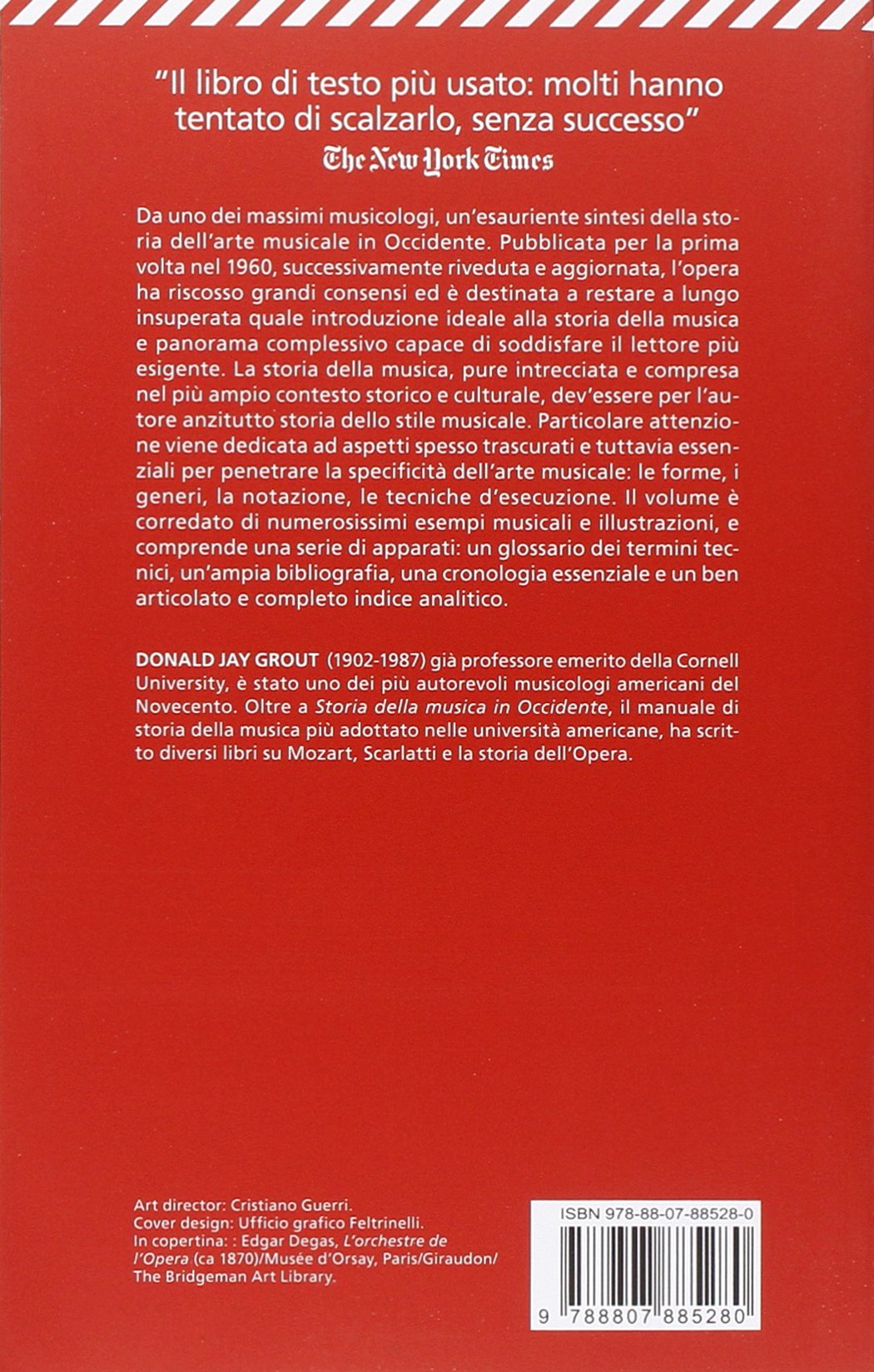 Sintesi completa della storia della Musica Occidentale scritta nel 1960 da Donald Jay Grout musicologo di grande fama mondiale. Riveduta e aggiornata nelle versioni successive questa panoramica della storia della musica rimane insuperata come introduzione alla conoscenza dell'evoluzione di quest'arte. L'autore si concentra soprattutto sull'evoluzione degli stili musicali analizzandone aspetti spesso trascurati come le forme, i generi, la notazione, le tecniche d'esecuzione e contestualizzandoli nelle loro rispettive epoche storiche e culturali di riferimento. Il volume è corredato di numerosissimi esempi musicali e illustrazioni, e comprende una serie di apparati: un glossario dei termini tecnici, un'ampia bibliografia, una cronologia essenziale e un ben articolato e completo indice analitico.