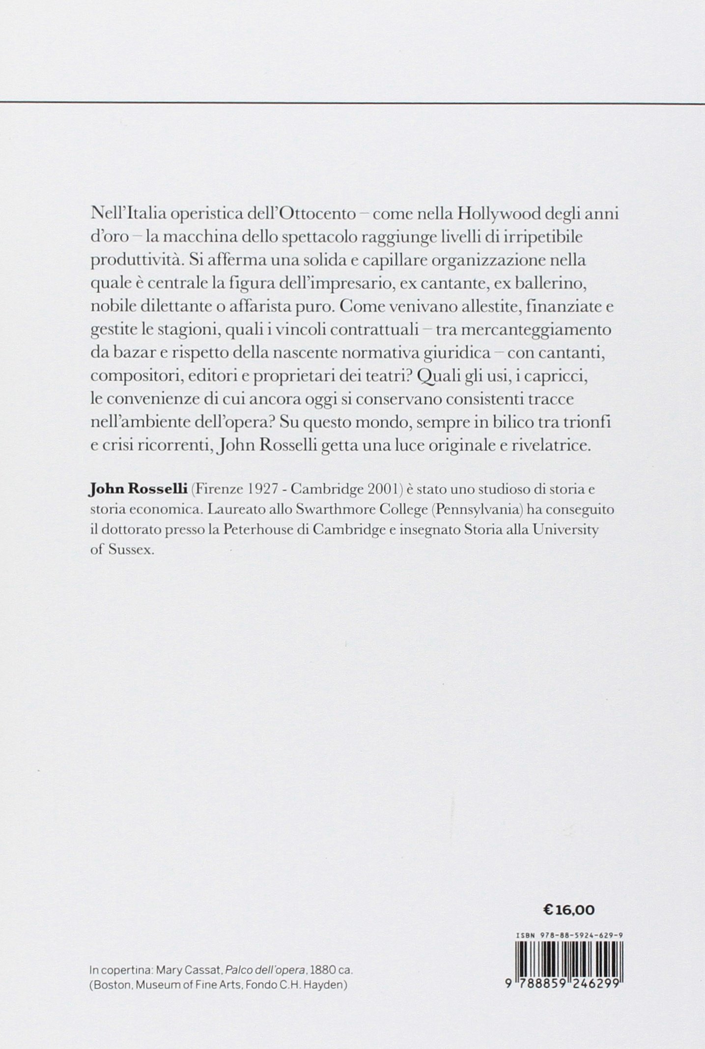 Come venivano allestite, finanziate e gestite le stagioni, quali i vincoli contrattuali - tra mercanteggiamento da bazar e rispetto della nascente normativa giuridica - con cantanti, compositori, editori e proprietari dei teatri? Quali gli usi, i capricci, le convenienze di cui ancora oggi si conservano consistenti tracce nell'ambiente dell'opera? Su questo mondo, sempre in bilico tra trionfi e crisi ricorrenti, John Rosselli getta una luce originale e rivelatrice.