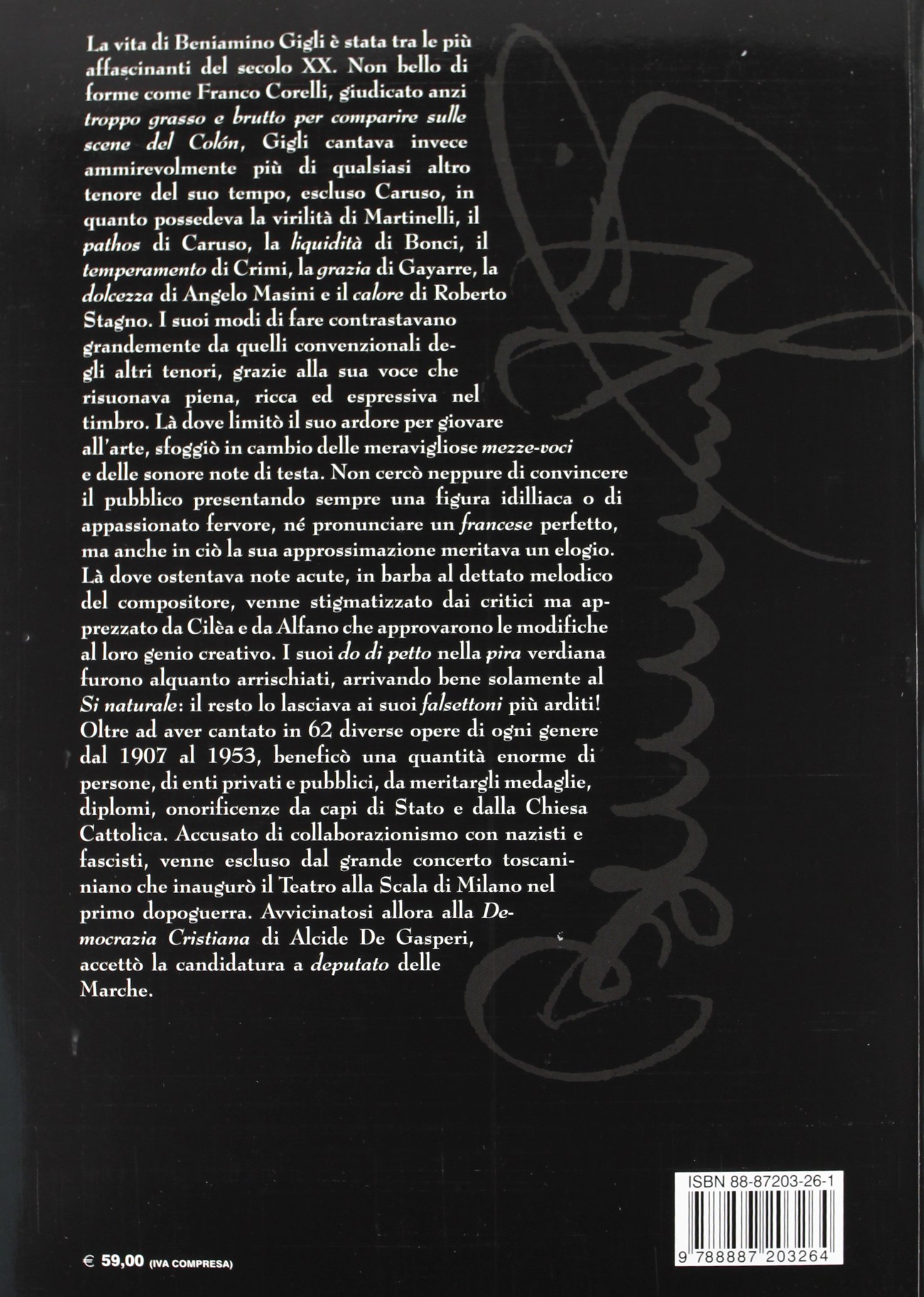 Il libro contiene: Oltre 300 illustrazioni - Le origini e gli studi - Le famiglie - La carriera - Il litigio col Metropolitan - I concerti - Attore cinematografico - La discografia - La Musica Sacra - Città delle esibizioni gigliane - Le opere della carriera - Cronologia - Documenti - Registrazioni - Film e cortometraggi.