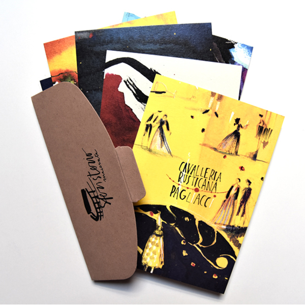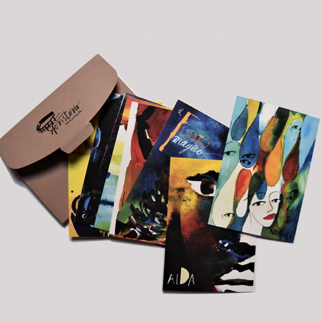 Il set composto da 10 cartoline disegnate dall'illustratrice Francesca Ballarini, raccoglie le immagini pittoriche delle Opere realizzate allo Sferisterio durante il Macerata Opera Festival dal 2015 al 2018.